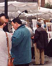 ゴシック地区を縦横に走る路地。ところどころに広場がある。簡単な木の台の上に、たくさんの絵を並べているのは、露店の画商たち。